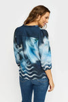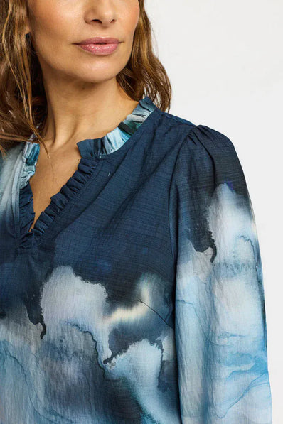 Bluse med 3/4-ærmer og V-udskæring med flæsedetaljer.