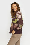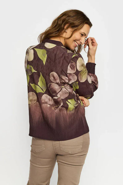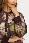 Bluse med lange ærmer og V-udskæring med stolpelukning og knapper i kontrastfarve.