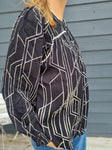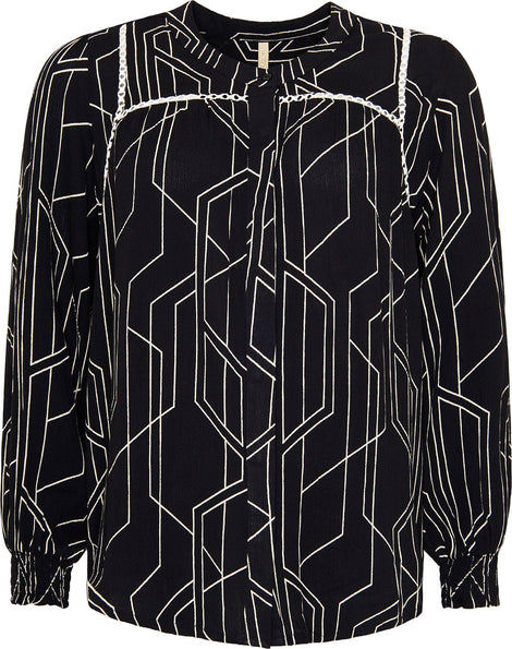 Ofelia bluse i sort og fint hvidt mønster. Skjorten er gennemknappet og i en let viskosekvalitet. Et lille smock ved ærmerne.