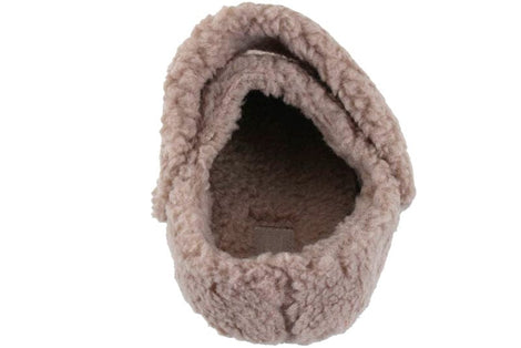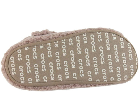 Crocs hjemmesko i lækkert blødt teddyplys.  Over vristen er der en rem i samme farve plys, som kan justeres, så den også kan sidde bagved hælen. Indvendigt er skoen også foret med brunt plys. Slidsålen er lavet af brunt tekstil. Super god og varm hjemmesko