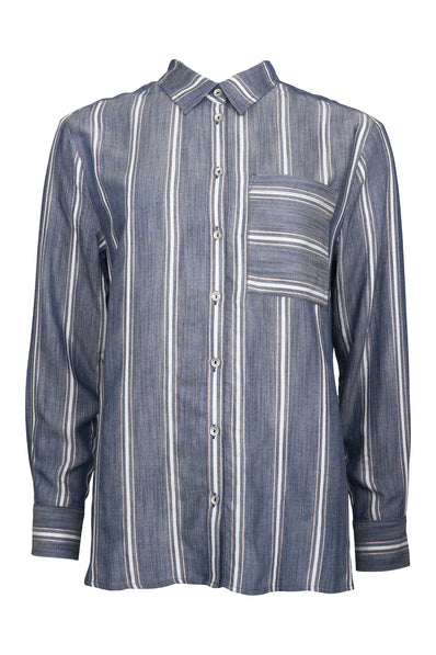 2B skjorte SIMONA i flotte striber. Skjorten har mange fine detaljer med lomme fortil, krave og flot mønster med striber og skinnede kobbertråd ned langs striberne. Brug skjorten lukket eller lad den stå åben med en t-shirt under.