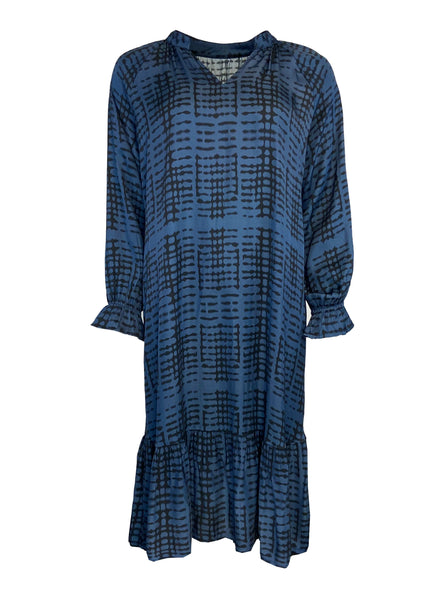 2B Telida kjole i en flot blå farve med mønster i. Kjolen går ned i v-hals og har elastik ved ærmerne, så man kan trække dem lidt op. Der er flot flæseeffekt i bunden i af kjolen, som gør at den får et rigtig flot fald. Kjolen er i den kendte lækre viskose/silke kvalitet.