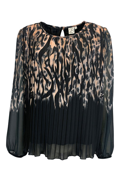 2B Tignes bluse i det flottest print, som hedder animal. Blusen er sort i grund farve og med en lys nuance i mønsteret. Den er i plisse og har det fineste fald. Ikke noget der sætter sig ind til kroppen. Den er med rund hals og lange ærmer. Der er lille elastikkant ved ærmerne. Der er knaplukning i nakken.