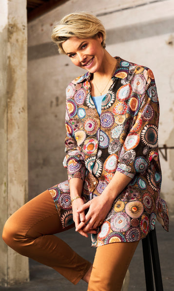 2B Side bluse i et flot multifarvet print i de brunlige nuancer. Blusen er en lidt længere model, så den kan sagtens bruges som en tunika. Brug den med jeans eller leggiens. Blusen går ned i v-hals og med knaplukning fortil. Så du kan bruge den lukket eller have den åben med en trøje under. Der er knaplukning ved ærmerne. Den er i det bløde viskose-silke. Brug den til både hverdag og fest.