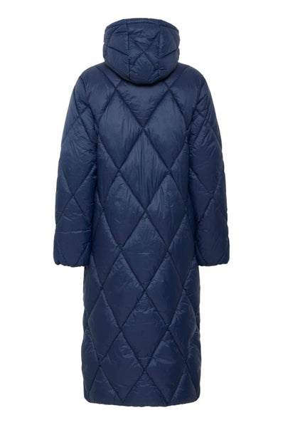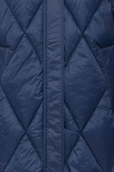 Lang og smart jakke fra B-young i den flotte blå. Jakken er med lommer, lynlås og trykknapper samt hætte. En dejlig lang jakke der luner godt hele vinteren.