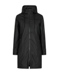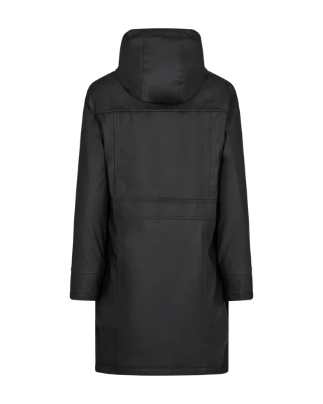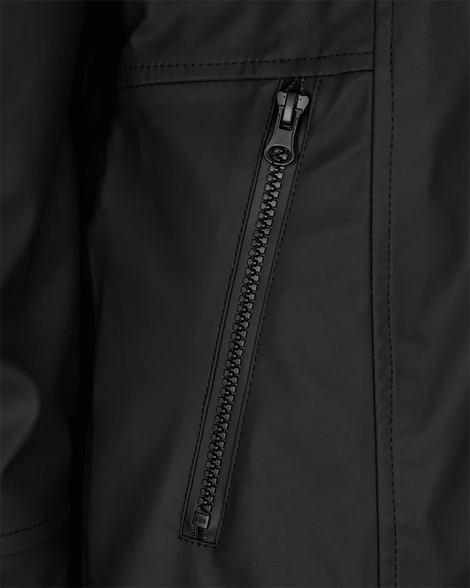 Coated regnjakke fra Freequent i en vandtæt kvalitet med et quiltet vatteret for og tapede sømme. Jakken har lange ærmer med indvendige stormmanchetter i rib, 2-vejs lynlåslukning med logoprint på underfaldet, sidelommer, eyelet ventilation under armene samt en justerbar snøre i hætten.