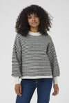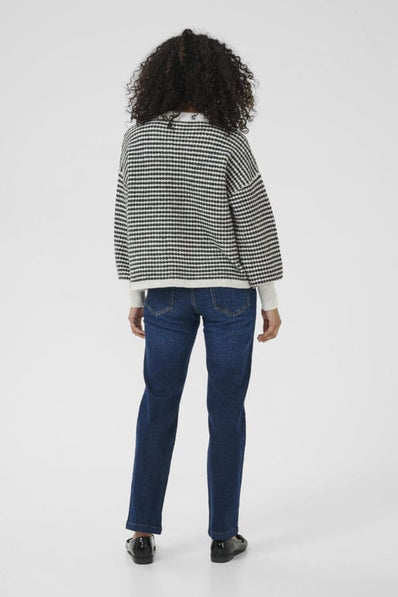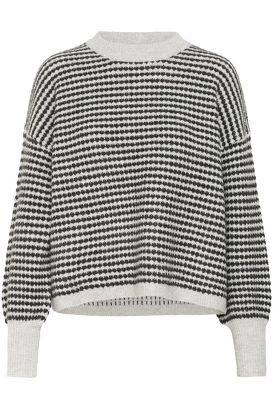 Kaffe strik i et flot mønster i de grå toner. Lys kontrastkant rundt langs kanten.