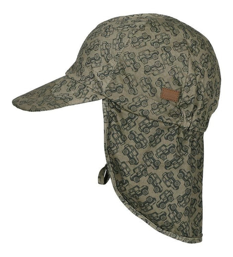 Melton solhat i armygrøn med et print af biler. Solhatten har skygge fortil og lang skygge bagtil. Der er elastik i nakken, så hatten sidder godt til. Solhatten kan bindes under hagen med bindebånd.