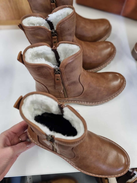 Smart damestøvle i brun imiteret skind. En lækker støvle med blødt og lunt foer. Støvlen er med indvendig lynlås, så den er nem at komme i og af. Den er med en flot pynte-lynlås på udvendig side. En god skridhæmmende ydersål.
