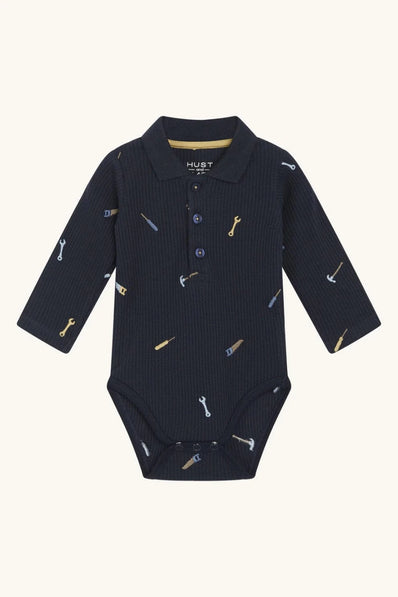 Langærmet bodystocking i ribkvalitet med krave og broderet arbejdsværktøjer Modellen knappes fortil og mellem benene.