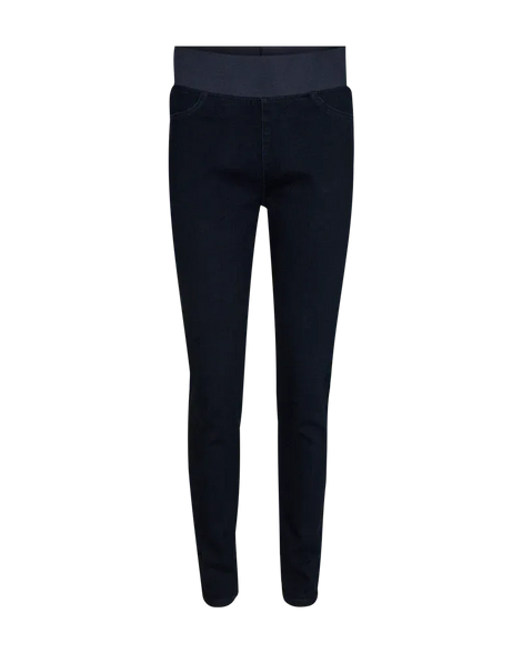 Bukser fra Freequent i en blød denim. Bukserne er enkle i modellen med en bred elastik i den høje talje, baglommer samt en tætsiddende pasform.