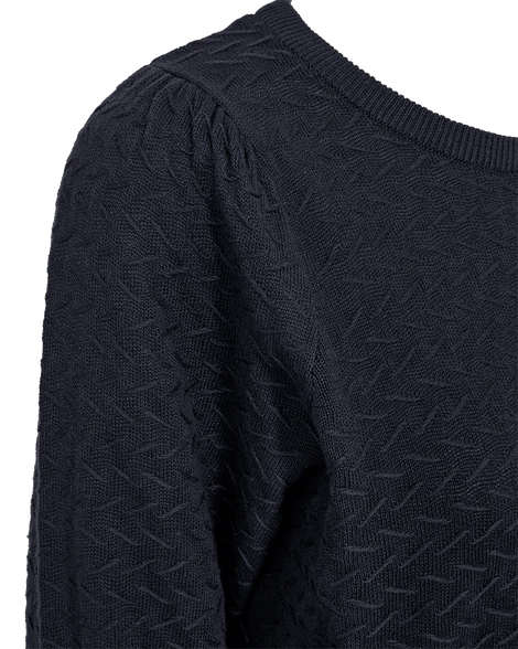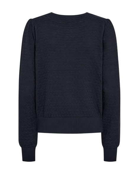 Pullover fra Freequent i en blød, finstrikket kvalitet. Pulloveren er enkel i modellen med lange ærmer, en rund halsudskæring samt brede ribkanter. Derudover har pulloveren et fint mønster der giver den et elegant udtryk.