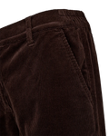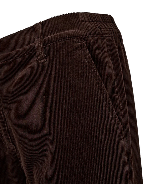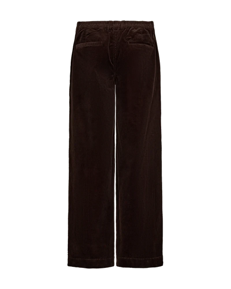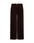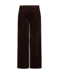 Bukser fra Freequent i en fløjlskvalitet. Bukserne er enkle i modellen med knap- og lynlåslukning, en høj talje, skrå sidelommer, en antydning af baglommer samt en vid pasform.