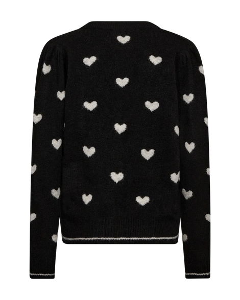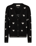 Cardigan fra Freequent i en blød, strikket kvalitet med et fint hjertemønster. Cardiganen har lange pufærmer, V-udskæring, hornknapper på fronten, en løs pasform samt ribkanter med en kontraststribe, der giver en flot effekt.