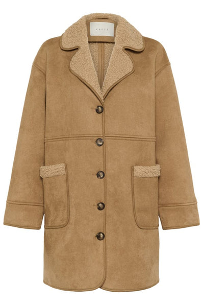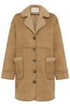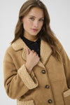 Smart jakke i en lækker brun farve og med lysere teddyfoer. Lukkes med store flotte knapper og med fine lommer i hver side.