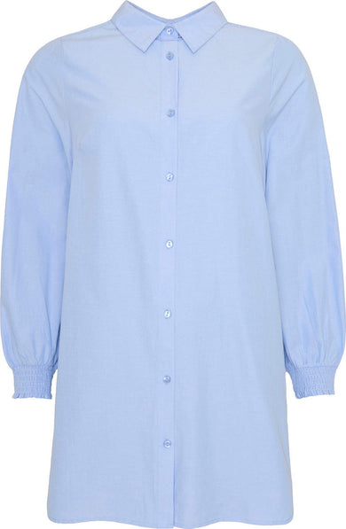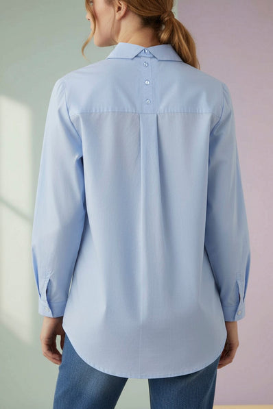 Smart skjorte i blå fra Ofelia med fine knapper ned fortil. Skjorten er med krave og med fine knapper bagpå.