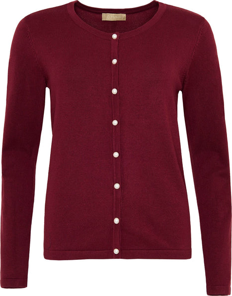 Let strikcardigan fra Ofelia i bordeaux og med flotte knapper.