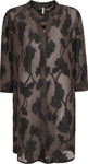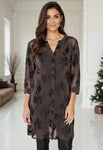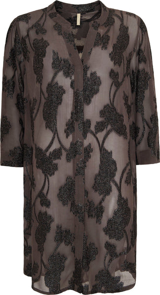 Ofelia tunika i en smuk mørkebrun og med fint blomstermønster med glimmer. Super fin som en lukket tunika, men kan også bruges åbenstående og med en top under.