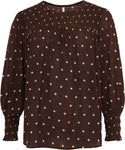 Ofelia bluse i den flotte brune og med prikker. En lækker blød viskose kvalitet og med smock ved ærmerne.