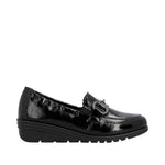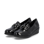 Rieker damesko i sort skind-lak. Skoen er på en god kilehæl og med elastikkant, som gør den sidder godt til. Smart spænde og god ydersål. God til både hverdag og fest