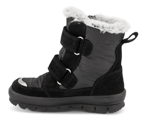 Overdelen i ruskind, tekstil-mesh og effektlæder giver et eksklusivt udtryk, mens den bløde kunstpelskant tilføjer et trendy touch. De smarte velcrolukninger gør det nemt for børnene selv at få støvlerne af og på – og de justerbare remme sikrer en god og individuel pasform.